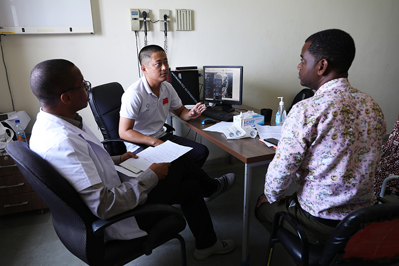 2023年2月22日,在坦桑尼亚桑给巴尔岛纳兹莫加医院,中国援桑给巴尔医疗队成员郭伟(左二)给病人看病。新华社记者董江辉摄