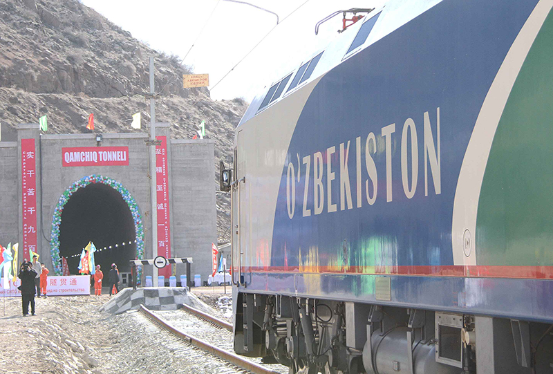 2016年2月27日,一列专列停在乌兹别克斯坦安格连-帕普铁路卡姆奇克隧道进口。中国政府优买项目、中铁隧道集团承担的中亚最长隧道——乌兹别克斯坦安格连-帕普铁路卡姆奇克隧道2月27日全隧贯通。新华社记者沙达提摄