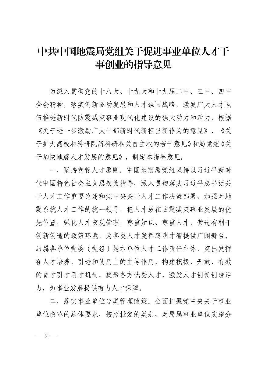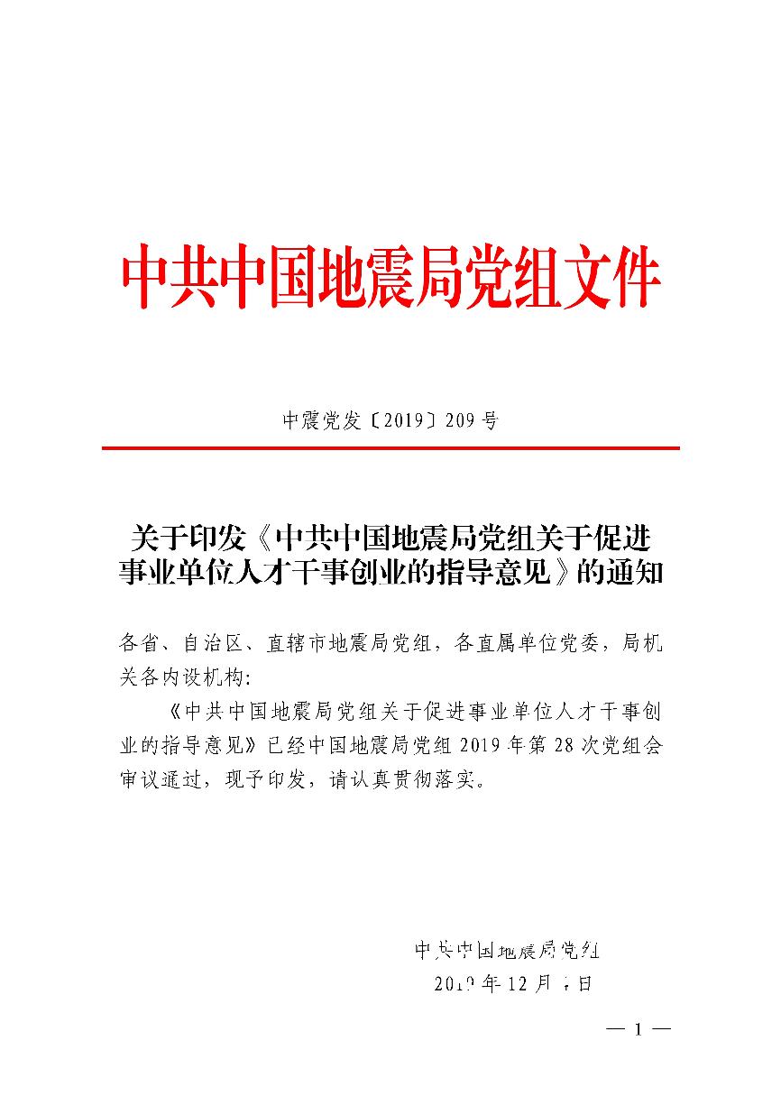 〔2019〕209号关于印发《中共中国地震局党组关于促进事业单位人才干事创业的指导意见》的通知