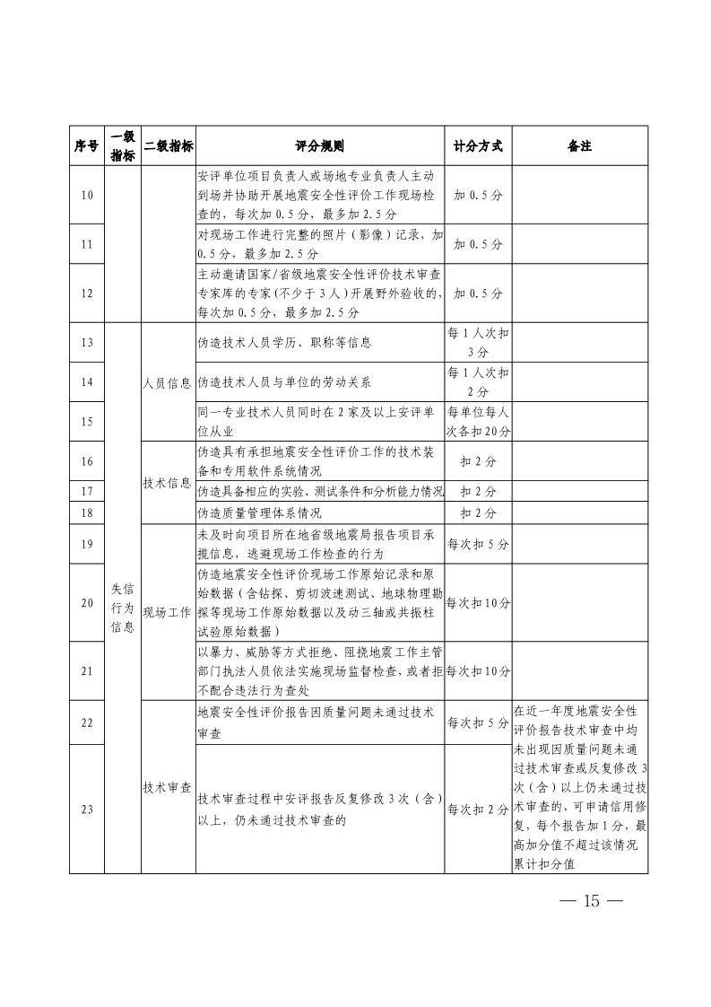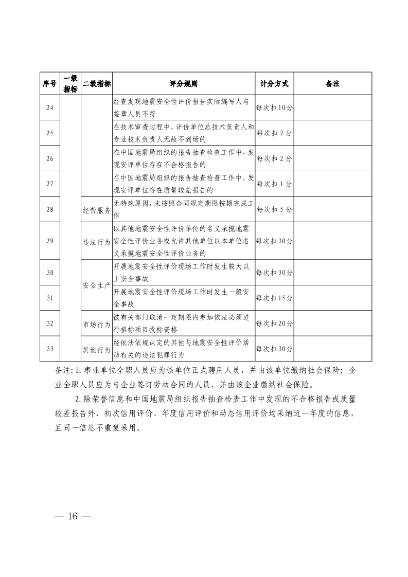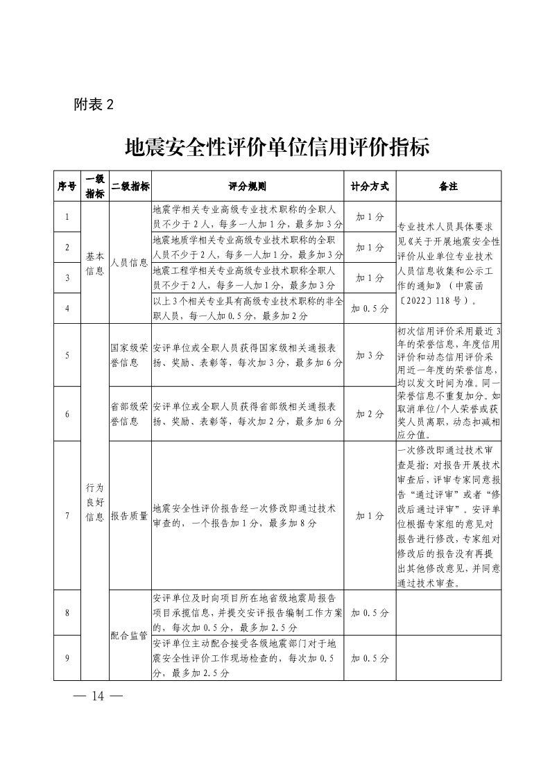 附表2 地震安全性评价单位信用评价指标