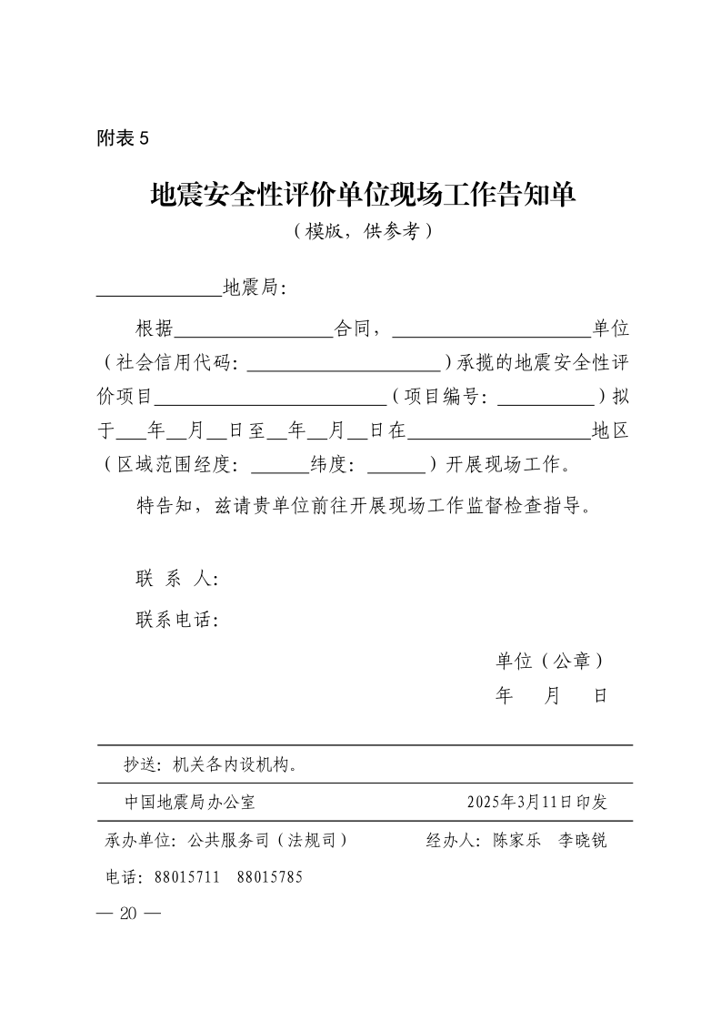 附表5 地震安全性评价单位现场工作告知单