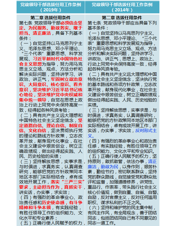 党的十八大以来,以习近平同志为核心的党中央鲜明提出新时期好干部标准,进一步强化党组织领导和把关作用,完善选人用人制度机制,严把选人用人政治关、品行关、能力关、作风关、廉洁关,坚决匡正选人用人风气,推动选人用人工作取得显著成效、发生重大变化。为深入贯彻习近平新时代中国特色社会主义思想和党的十九大精神,全面贯彻新时代党的建设总要求和新时代党的组织路线,更好坚持和落实党管干部原则,党中央对《党政领导干部选拔任用工作条例》进行了修订,并发出通知,要求各地区各部门结合实际认真遵照执行。下面,通过梳理比对新旧条例内容,我们可以进一步了解条例的修订情况。