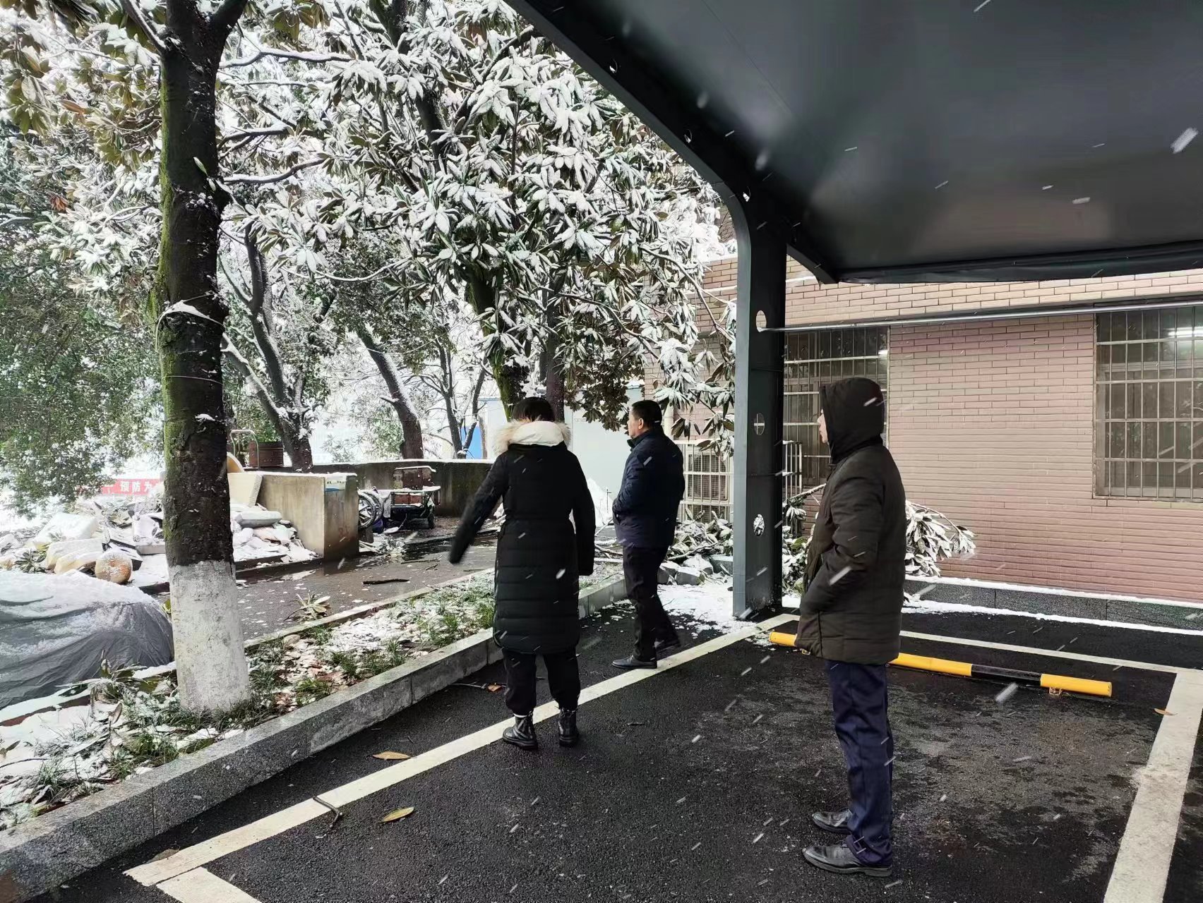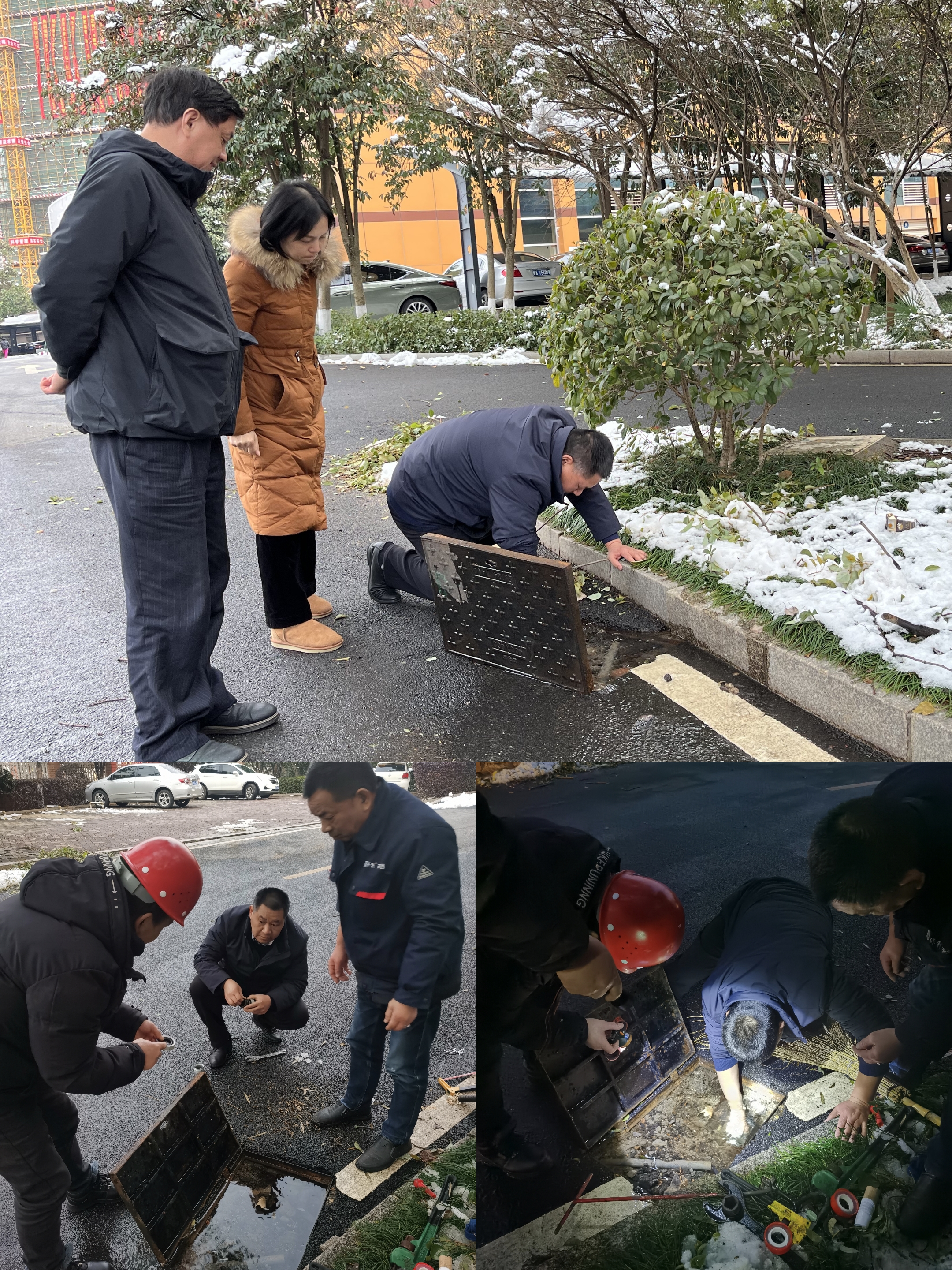 迎“雪”而上,全力消除安全隐患。22日清晨,为保障人员出行安全,后勤服务中心紧急采购防滑麻袋,不惧严寒,带领物业人员第一时间开展除雪工作,准备充足的应急物资。通过铲雪、撒除雪剂、放置防滑麻袋等方式,确保院内出入要道通行安全。同时,加强院内安全隐患排查,22日上午、下午、晚上三次开展院内大巡逻,紧急处置车棚顶部积雪、联系专业绿化公司对大雪压倒树木和积雪较多的隐患树枝进行修剪,消除安全隐患。24日,针对院内水管因冰冻爆裂的突发情况,分管局领导曾建华高度重视,第一时间前往现场指导工作,后勤服务中心工作人员不畏寒冷,在冰水中抢修好了水管。