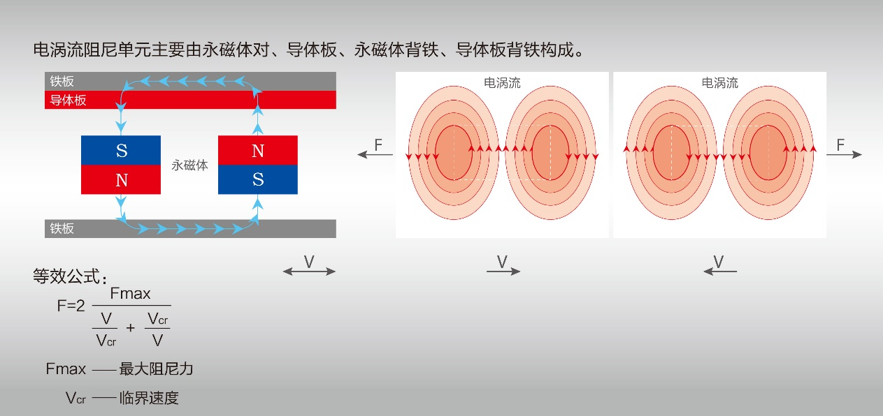 当导体板(铜板或铝板)在两块永磁体之间的空气间隙中沿垂直于磁感应强度方向运动时,导体板中产生电涡流。涡流场与磁场相互作用,产生的洛伦兹力将阻碍导体板和磁场之间的相对运动(楞次定理),同时电涡流因导体板中的电阻作用而转化为热能耗散掉,产生阻尼效应。当导体板或永磁体与振动结构连接时,导体板上不断地有电涡流产生,同时结构的动能不断地转化为导体板中的热能,使结构振动逐渐衰减。