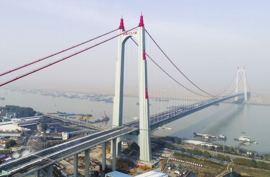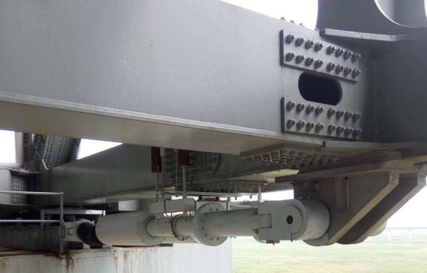 大桥主桥为双塔双跨钢桁架不对称悬索桥结构,跨径布置为1480+453.6m,主梁采用桁板结合梁。为控制大桥在地震和车辆荷载作用下的振动响应,在桥塔(锚碇)与主梁连接处安装了8套阻尼力150吨级的电涡流轴向阻尼器。