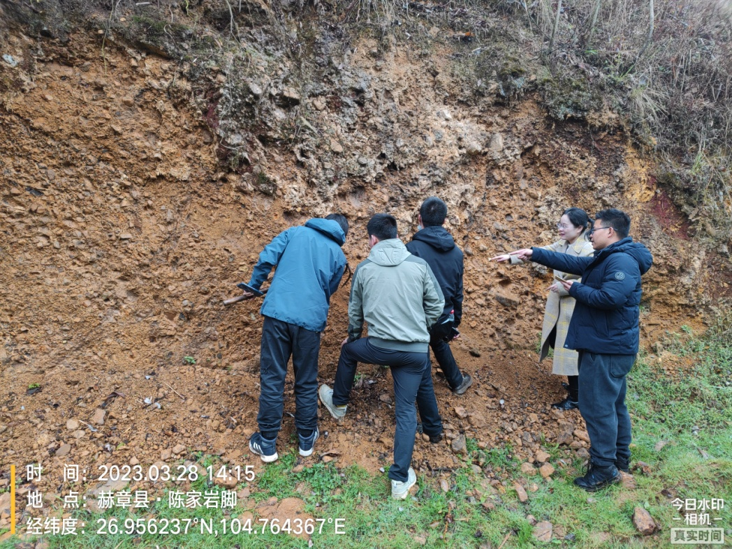 在六盘水、毕节地区,技术团队与贵州省工程防震研究院活断层探测项目专家实地考察六盘水市活断层探测项目的威宁—水城断裂和紫云—垭都断裂的野外探槽剖面。技术团队进入探槽剖面现场,认真查看断裂错动特征,与项目负责同志交流讨论断层活动时代和鉴定情况。