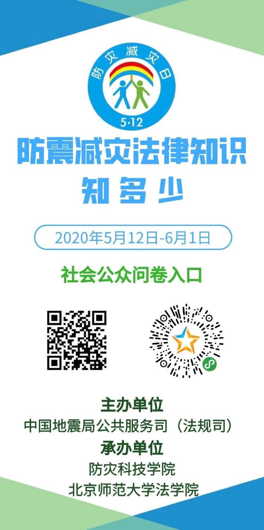 为全面了解社会公众对《防震减灾法》的认识和理解情况,中国地震局公共服务司(法规司)主办了本次“防震减灾法律知多少”问卷调查活动,欢迎大家积极参与!