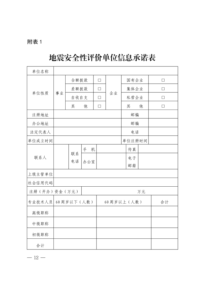 附表1 地震安全性评价单位信息承诺表